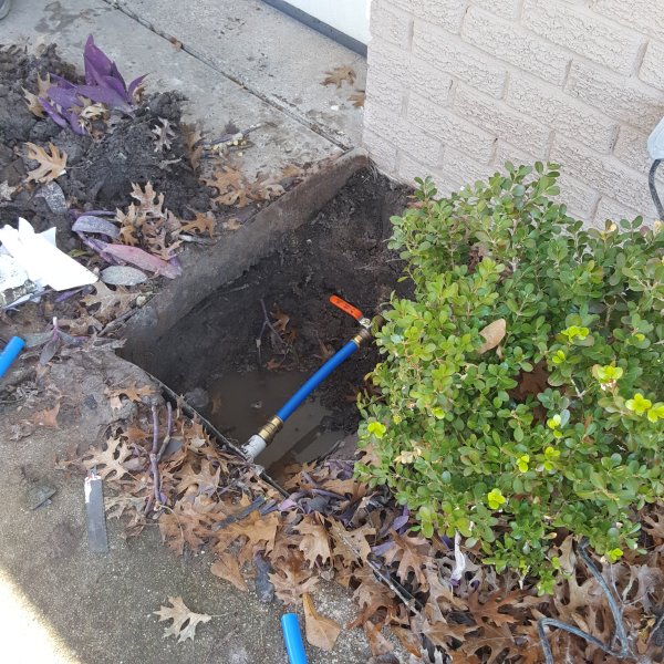 Red Flag #2, While they are running the air into the pipes, Clay and I clearly observe water gushing from a pipe in the area of the secondary cutoff at the front of the house that faces towards the back.